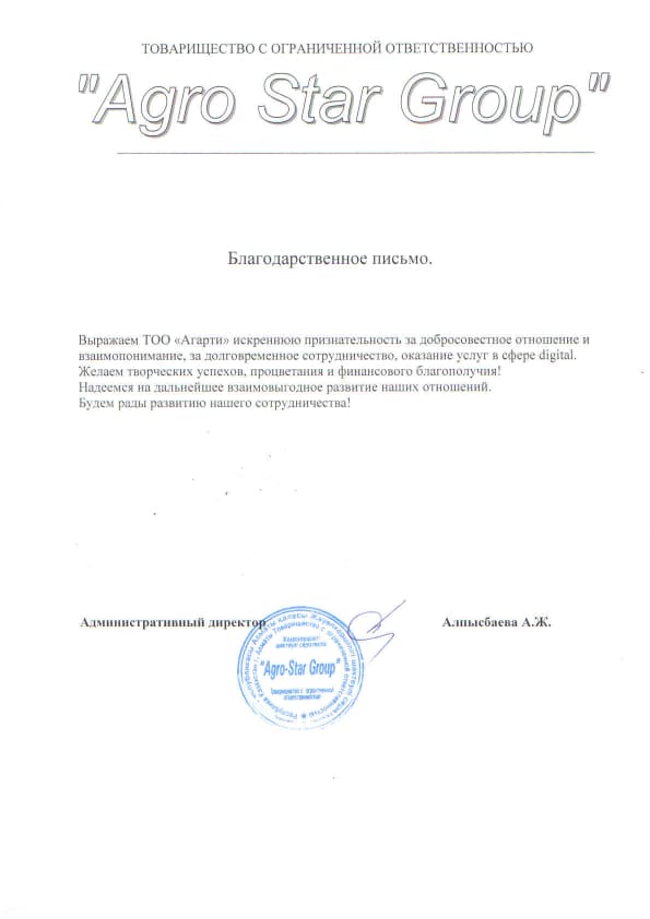 "Благодарственное письмо в адрес ТОО «Агарти» за профессиональный подход, добросовестное отношение и долгосрочное сотрудничество."
