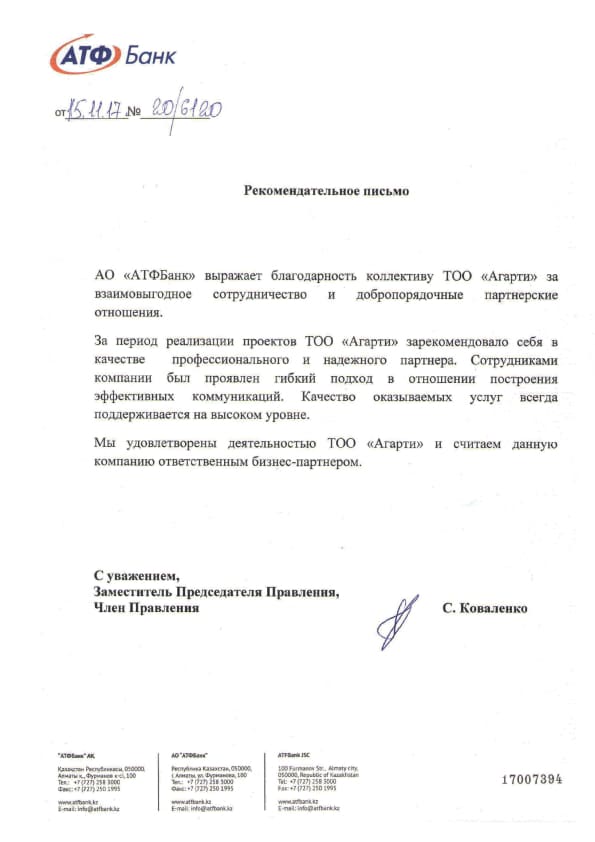 "АО «АТФБанк» выражает благодарность коллективу ТОО «Агарти» за взаимовыгодное сотрудничество и добропорядочные партнёрские отношения. Сотрудниками компании был проявлен гибкий подход в отношении построения эффективных коммуникаций. Качество оказываемых услуг всегда поддерживается на высоком уровне."
