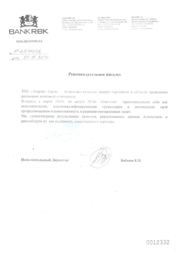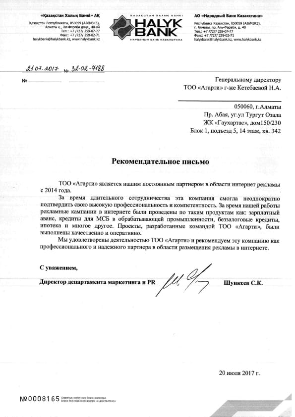 "ТОО «Агарти» является нашим постоянным партнёром в области интернет-рекламы с 2014 года. Компания смогла неоднократно подтвердить свою высокую профессиональность и компетентность. Мы рекомендуем ТОО «Агарти» как профессионального и надёжного партнёра в области размещения рекламы в интернете."