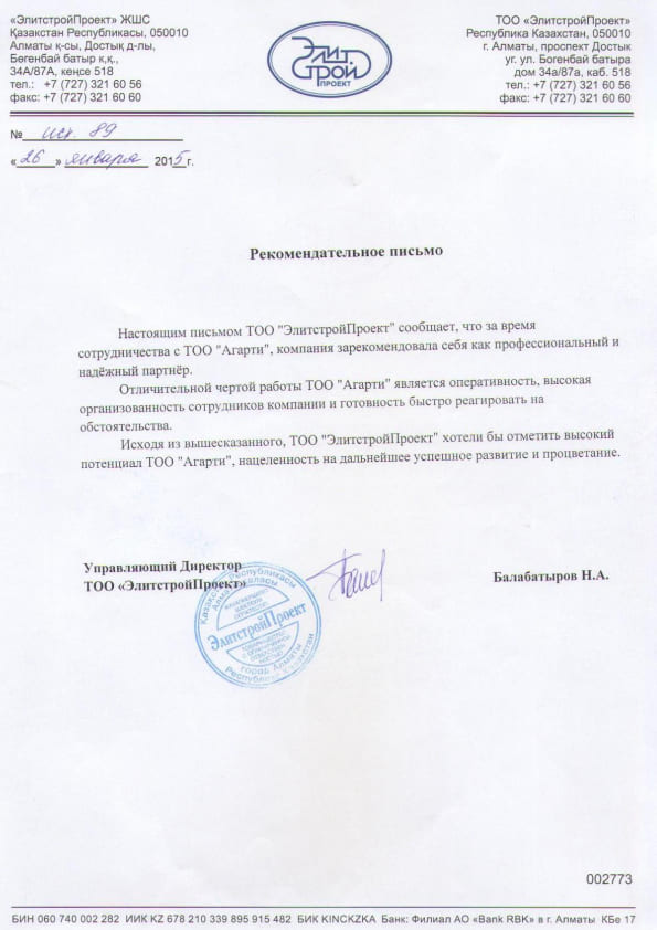 "ТОО «ЭлитстройПроект» сообщает, что за время сотрудничества с ТОО «Агарти», компания зарекомендовала себя как профессиональный и надёжный партнёр. Отличительной чертой работы ТОО «Агарти» является оперативность и готовность быстро реагировать на любые обстоятельства."