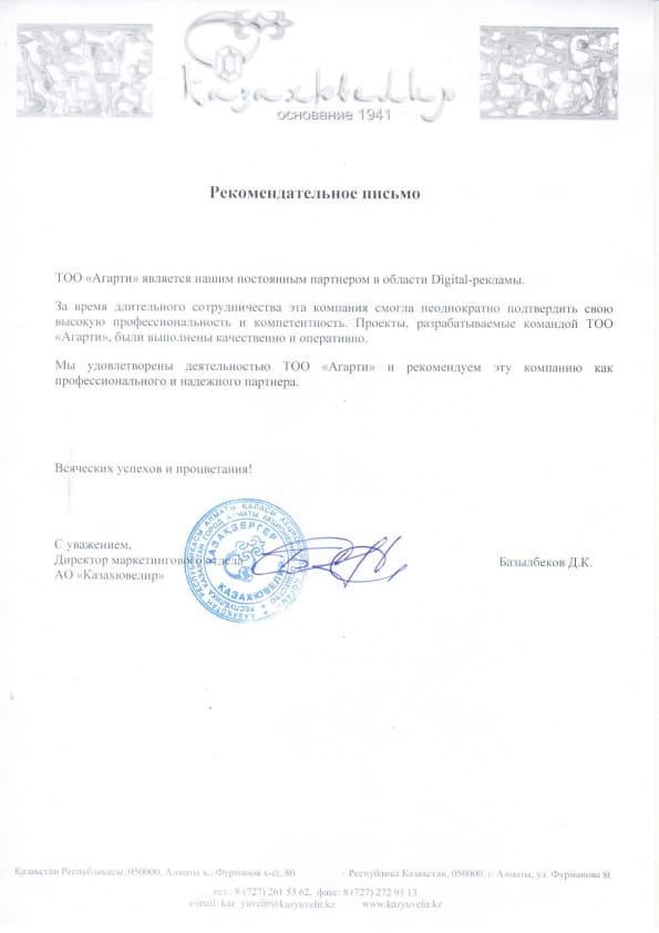 "ТОО «Агарти» является нашим постоянным партнёром в области Digital-рекламы. За время длительного сотрудничества эта компания смогла неоднократно подтвердить свою высокую профессиональность и компетентность. Мы рекомендуем эту компанию как профессионального и надёжного партнёра."
