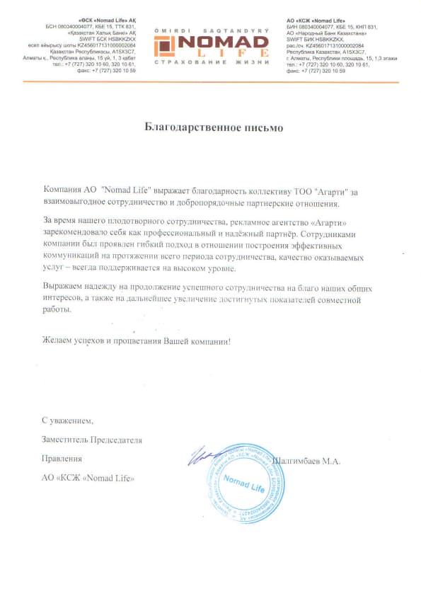 "Компания АО «Nomad Life» выражает благодарность коллективу ТОО «Агарти» за взаимовыгодное сотрудничество. Рекламное агентство «Агарти» зарекомендовало себя как профессиональный и надёжный партнёр. Качество оказываемых услуг на протяжении всего периода сотрудничества всегда поддерживается на высоком уровне."