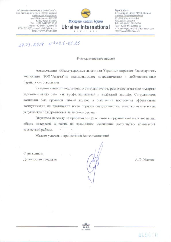 "Авиакомпания «Международные авиалинии Украины» выражает благодарность коллективу ТОО «Агарти» за взаимовыгодное сотрудничество. Рекламное агентство «Агарти» зарекомендовало себя как профессиональный и надёжный партнёр. Качество оказываемых услуг всегда поддерживается на высоком уровне."