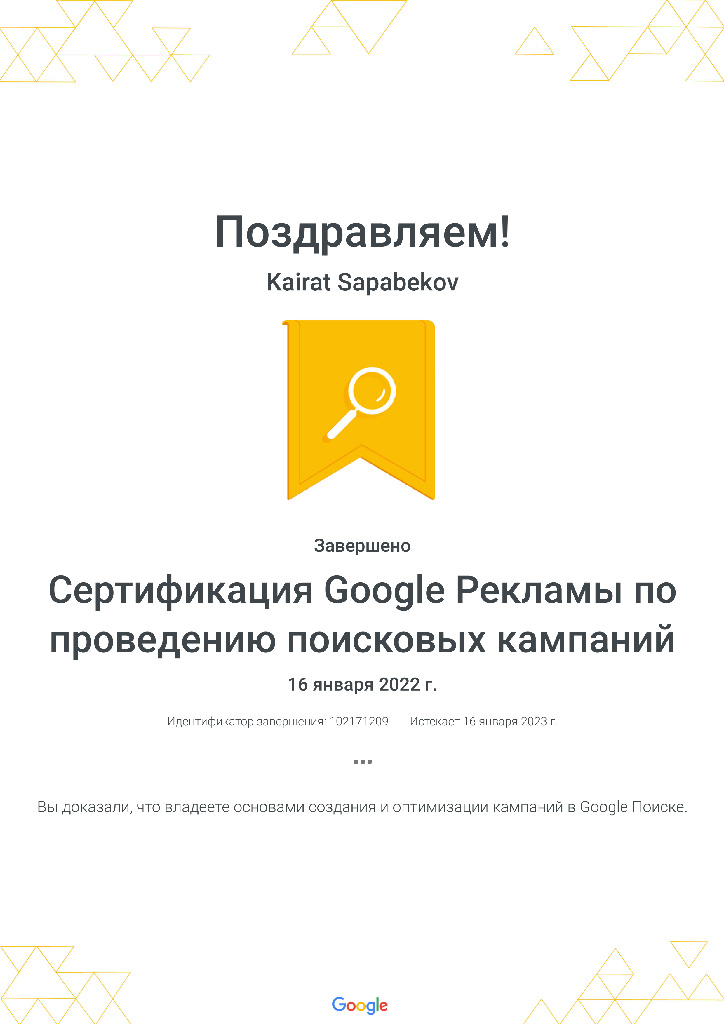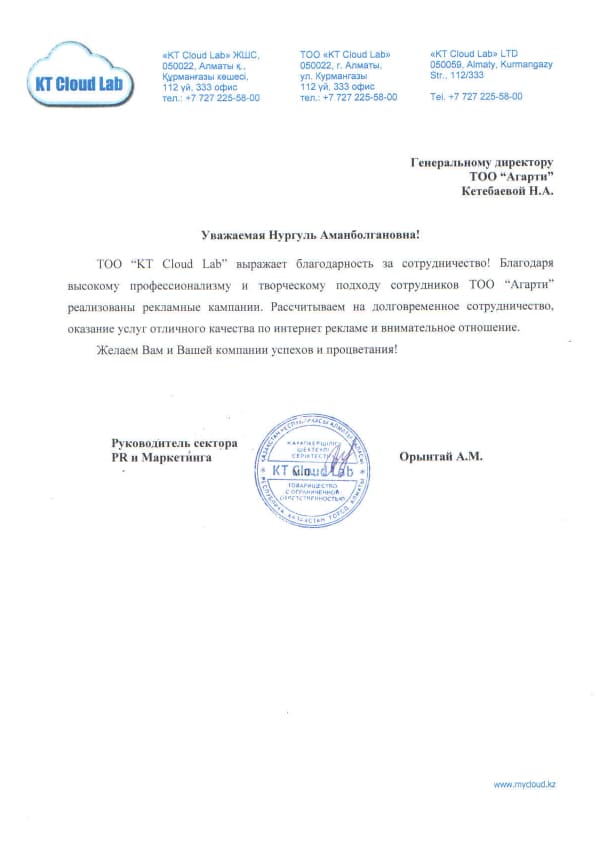 "ТОО «KT Cloud Lab» выражает благодарность за сотрудничество! Благодаря высокому профессионализму и творческому подходу сотрудников ТОО «Агарти» реализованы рекламные кампании. Рассчитываем на долговременное сотрудничество и оказание услуг отличного качества по интернет-рекламе."