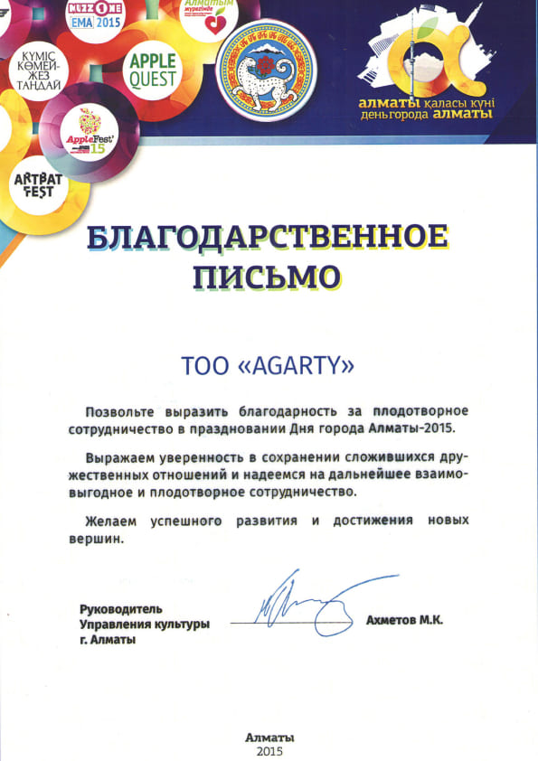 "Позвольте выразить благодарность ТОО «Агарти» за плодотворное сотрудничество в праздновании Дня города Алматы-2015. Выражаем уверенность в сохранении сложившихся дружественных отношений и надеемся на дальнейшее взаимовыгодное и плодотворное сотрудничество."