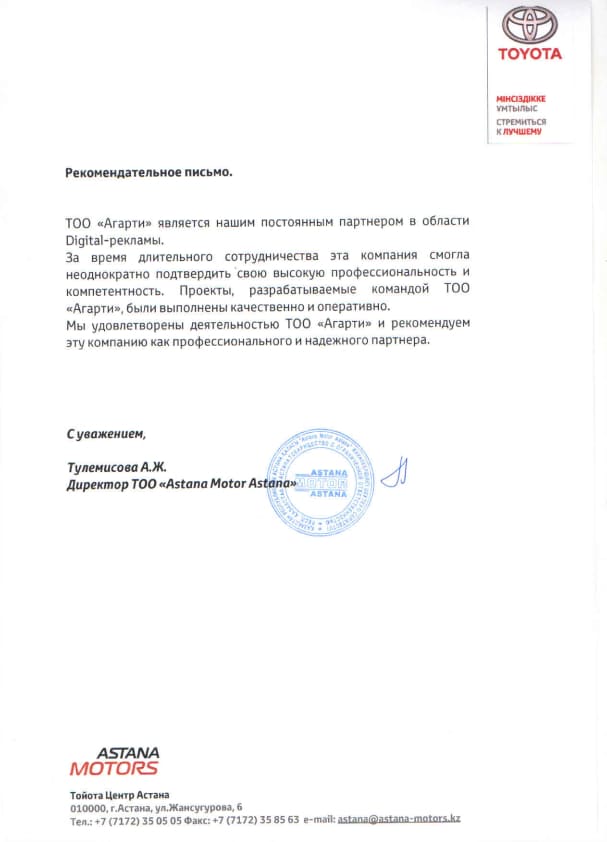 "ТОО «Агарти» является нашим постоянным партнёром в области Digital-рекламы. За время длительного сотрудничества компания смогла неоднократно подтвердить свою высокую профессиональность. Мы рекомендуем ТОО «Агарти» как профессионального и надёжного партнёра."