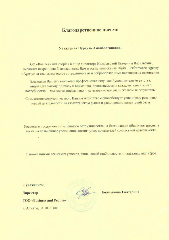 "ТОО «Business and People» выражает искреннюю благодарность Digital Performance Agency «Agarty» за взаимовыгодное сотрудничество. Благодаря высокому профессионализму, индивидуальному подходу и вниманию к каждому клиенту мы всегда оперативно и качественно получали желаемые результаты."