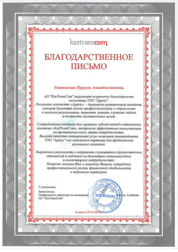 "АО «KazTransCom» выражает искреннюю благодарность компании «Agarty» — лучшему рекламному агентству, которое помогает достигать высоких результатов. Сотрудники компании проявили себя в построении эффективных коммуникаций на протяжении всего этапа сотрудничества."