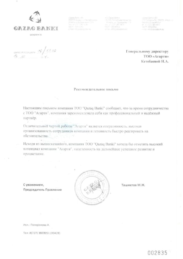 "ТОО «Qazaq Banki» сообщает, что за время сотрудничества с ТОО «Агарти», компания зарекомендовала себя как профессиональный и надёжный партнёр. Отличительной чертой работы «Агарти» является оперативность и высокая организованность сотрудников компании."