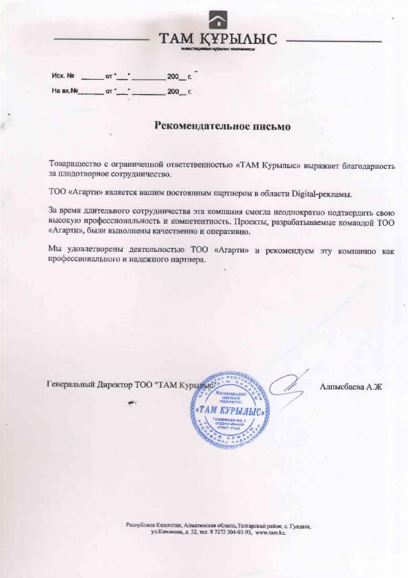"Благодарственное письмо в адрес ТОО «Агарти» за профессиональный подход, добросовестное отношение и долгосрочное сотрудничество."