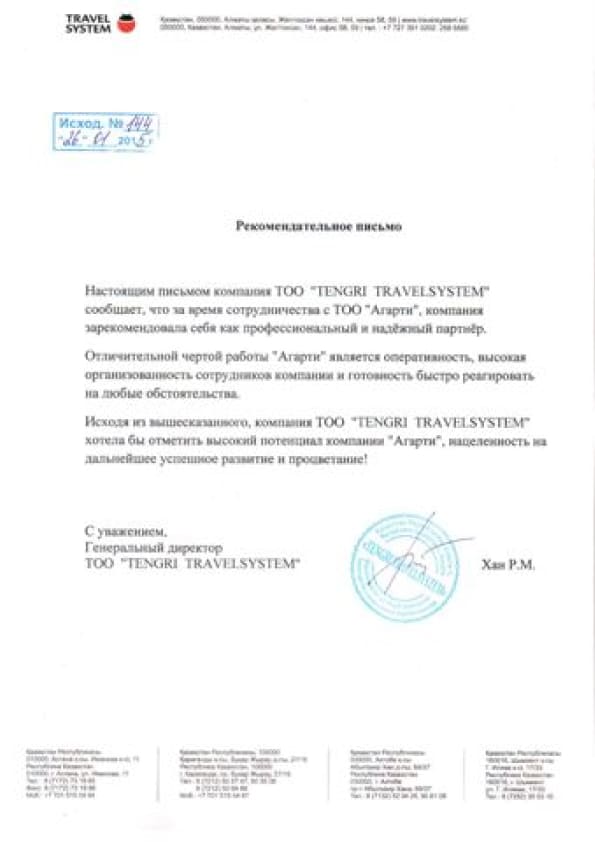 "За время сотрудничества с ТОО «Агарти», компания ТОО «TENGRI TRAVELSYSTEM» зарекомендовала себя как профессиональный и надёжный партнёр. Отличительной чертой работы «Агарти» является оперативность, высокая организованность и готовность быстро реагировать на любые обстоятельства."
