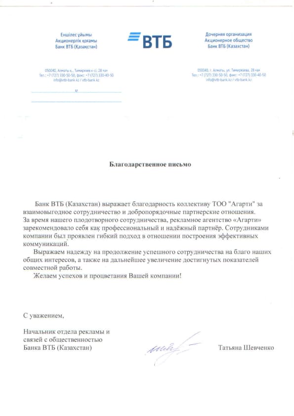 "Банк ВТБ (Казахстан) выражает благодарность коллективу ТОО «Агарти» за взаимовыгодное сотрудничество. Рекламное агентство «Агарти» зарекомендовало себя как профессиональный и надёжный партнёр. Был проявлен гибкий подход в построении эффективных коммуникаций."